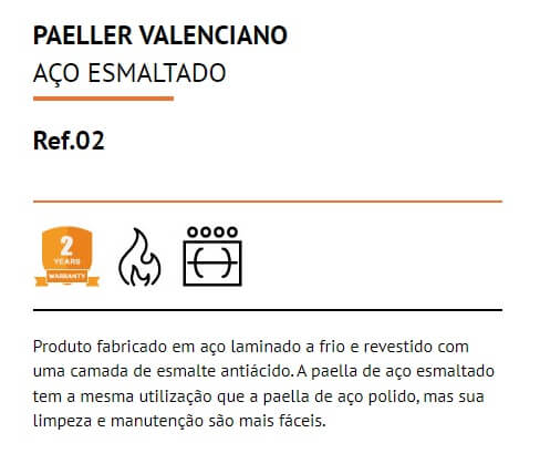 Produto fabricado em aço laminado a frio e revestido com uma  camada de esmalte antiácido. A paella de aço esmaltado tem a mesma utilização que a paella de aço polido, mas sua limpeza e manutenção são mais fáceis.